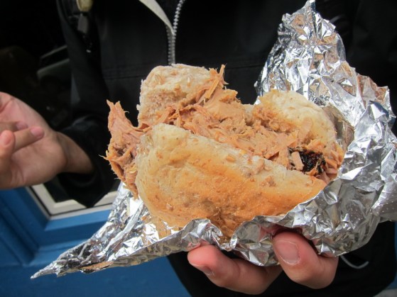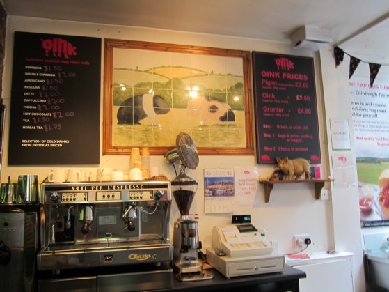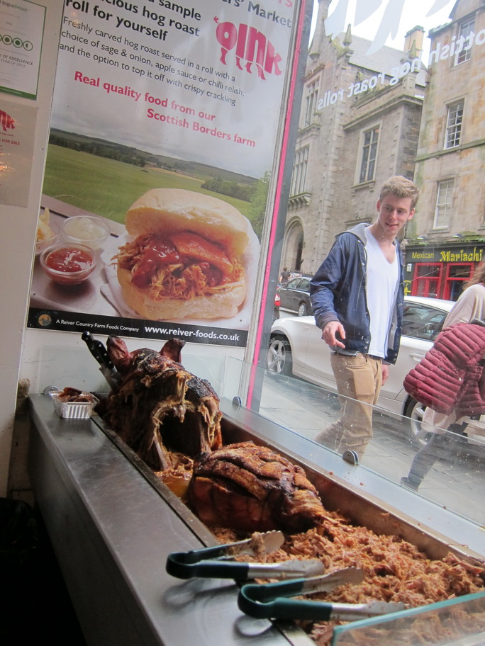 And that was all of the haggis we could handle in two days, so we knew that we had to have something else to eat in Edinburgh. Mr. Selfish has become obsessed with pork sandwiches ever since we had the porchetta sandwich from Roli Roti at the Ferry Building in San Francisco. So, when we saw a roasting pig in the window of Oink, Mr. Selfish insisted that we lunch there. It was a very yummy pulled pork sandwich, not as good as Roli Roti but definitely worth a visit.