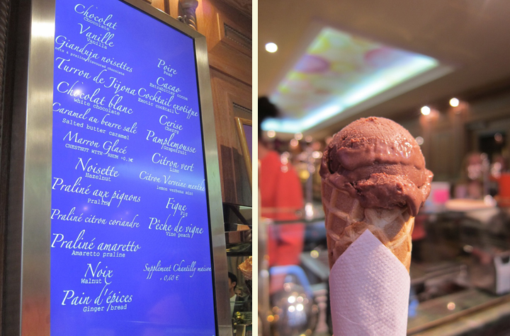 Finally, there is a Berthillon ice cream shop also in the 4th Arrondissement. The first Berthillon shop opened in 1954 and they’ve been selling amazing ice cream and sorbet ever since. Its ice creams are made from milk, sugar, cream, and eggs only and contain no preservatives, artificial sweeteners. They are also utterly delicious. At this store in the 4th, Mr. Selfish and I tried the salted butter caramel and the chocolate with nuts and praline. Both were quite tasty!