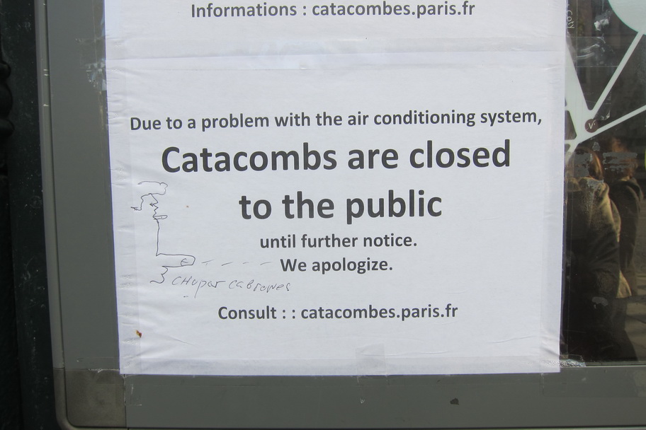 As for the Catacombs, it was a huge disappointment. I had been looking forward to the Catacombs since we arrived in Paris, and we decided to wait until Halloween to do it. However, on Halloween, it was a bright and sunny day so we changed plans and went to the Père Lachaise Cemetery instead. Then, when we went to the Catacombs a few days later, it was closed. Yes, closed due to some sort of air conditioning problem. I called the Catacombs every day after that to inquire if it was open but to no avail. It remained closed until we left Paris.
