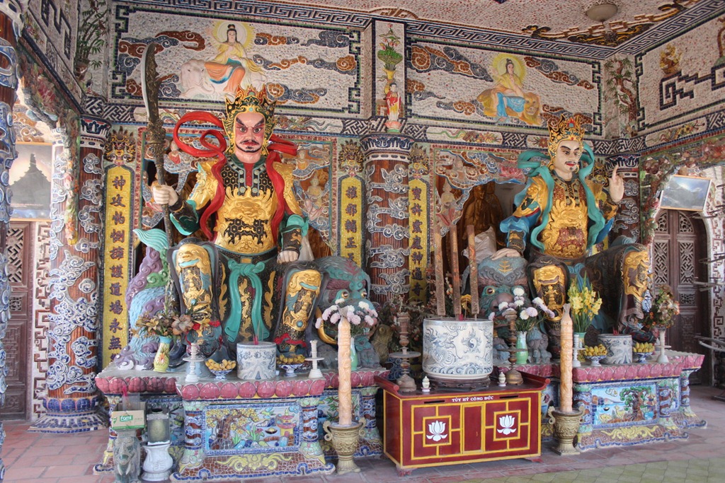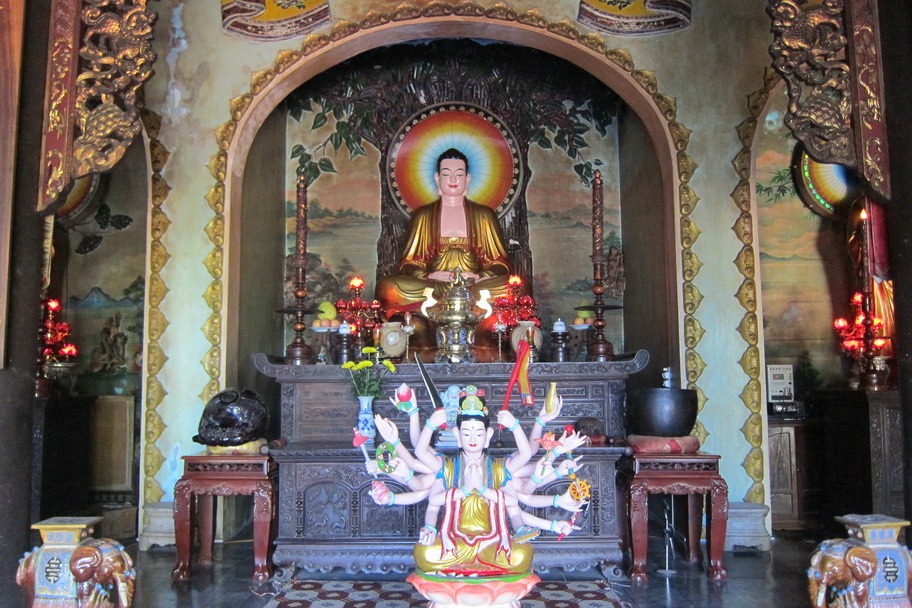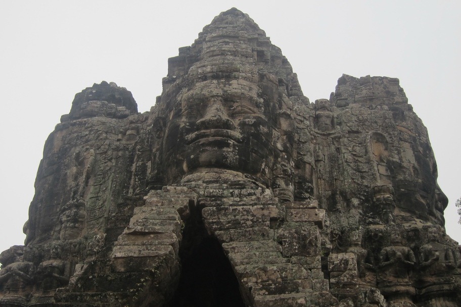 There are four gates into Angkor Thom with the most scenic gate being the South Gate. The road leading to the South Gate is lined with many different sculptures – all with different expressions on their faces and in varying states of repair. Each gate is then crowned with four faces.