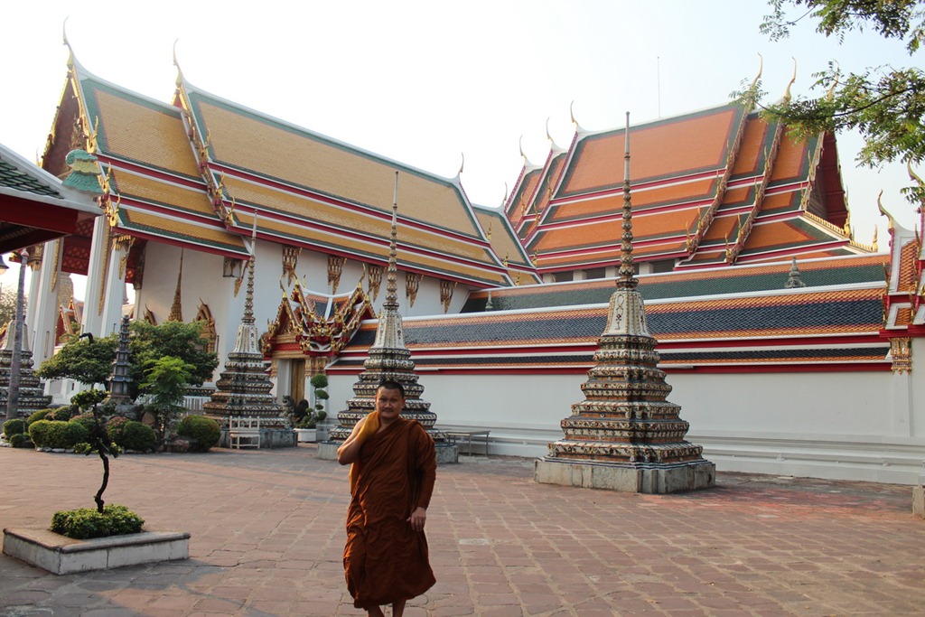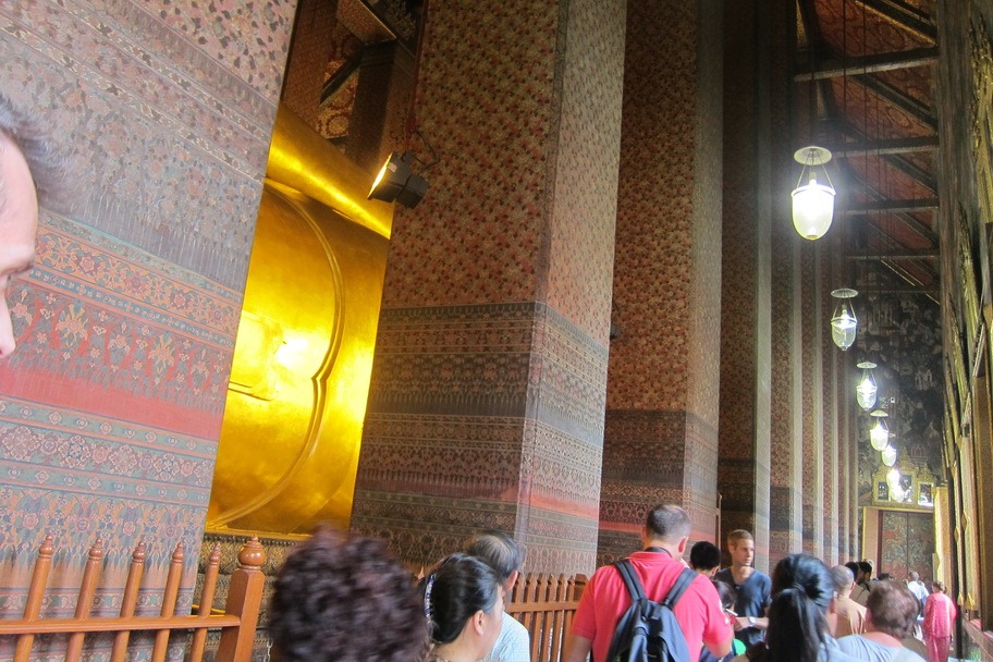 Next, we took a taxi (always use metered taxis in Thailand) to Wat Pho, which has the largest reclining Buddha in the world. The Buddha is 15 meter high and 43 meter long. It’s hard to take good photos of the Buddha due to the columns but the best shots are all the way at the end toward the Buddha’s feet. A dress code of long pants and no sleeveless shirts is strictly enforced. However, an attendant will provide you with a shawl if you do not meet the dress code.