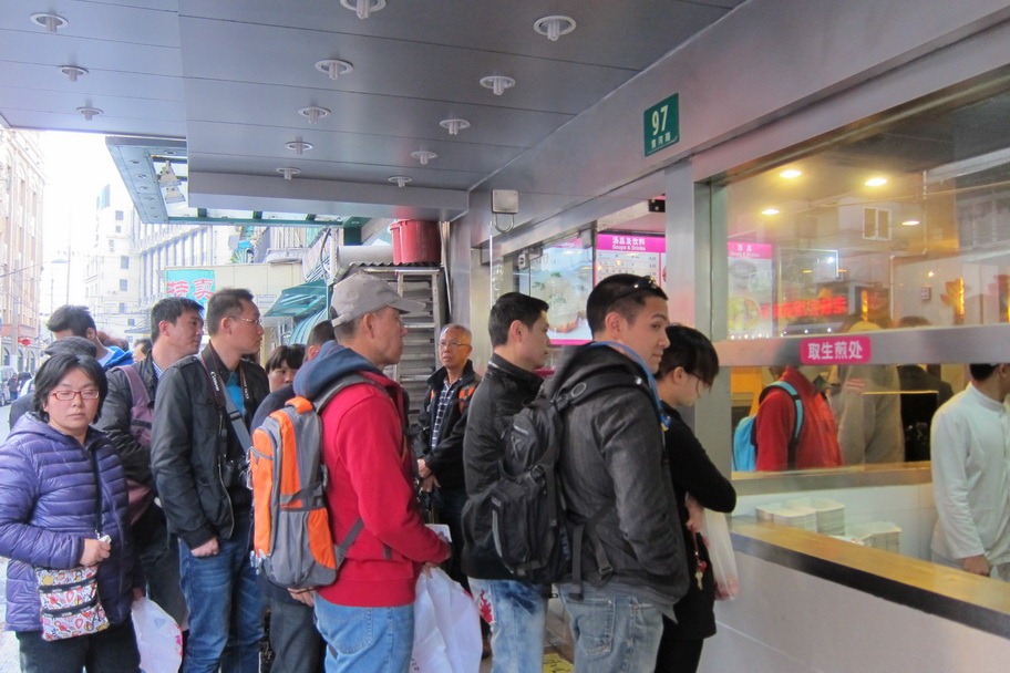 First, we went to Nanxiang Steamed Buns Restaurant (20号 Yuyuan New Rd.) at Yuyuan Garden for its well-known xiaolongbao. We visited the restaurant during the mid-afternoon on a Tuesday, and the outside queue was still ridiculously long. I scoped out the inside of the restaurant and discovered that you could order inside even though it was a little more expensive. After looking at the queue outside, Mr. Selfish and I figured that it would be worth it to eat inside the restaurant.