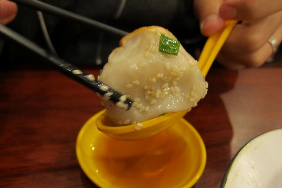 Here, you also order at the counter, pay up, sit down, place your receipt on the table, and wait for the staff to bring you your order. When the lady at the counter figured out that we weren’t Chinese, she gave us an English menu. It cost 27 yuan for 12 steamed pork and crab meat dumplings.