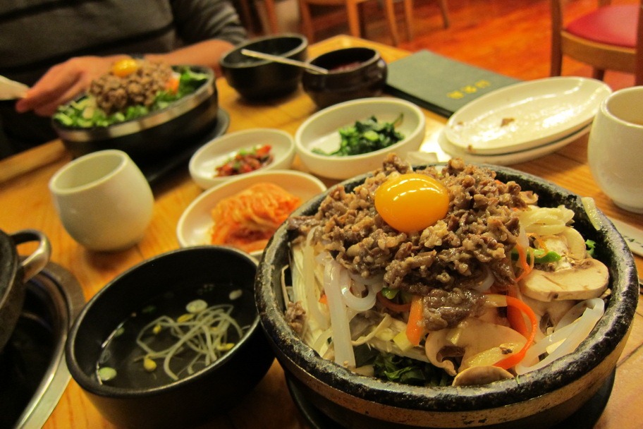 Next, we tried a chain bibimbap restaurant called Bibigo. We visited the one located at the Gwanghwamun Official Building Sinmunno-1-ga, Jongro-gu 110-999. Here, you had the ability to customize your bibimbap by choosing your rice (white, black, brown & white, or barley & white), your meat topping (bulgogi, chicken, pork, or tofu), and your sauce (kohot, citron soy, sesame, or ssam).
