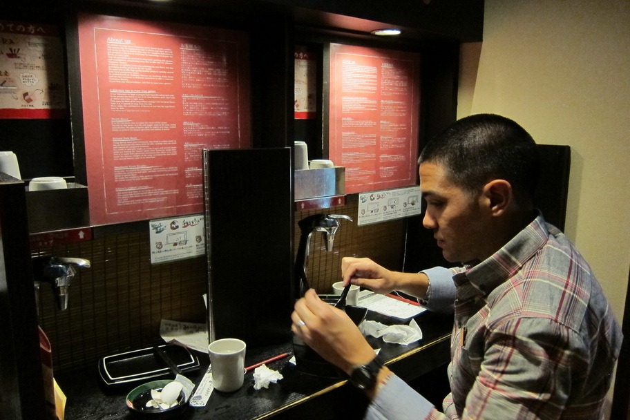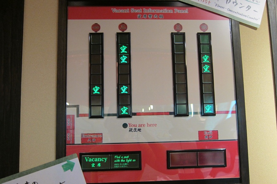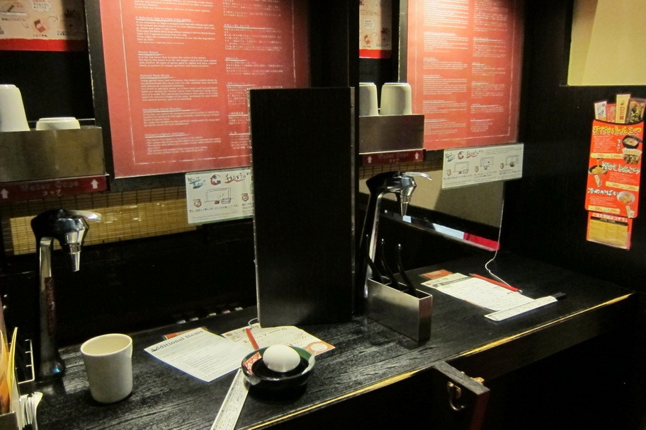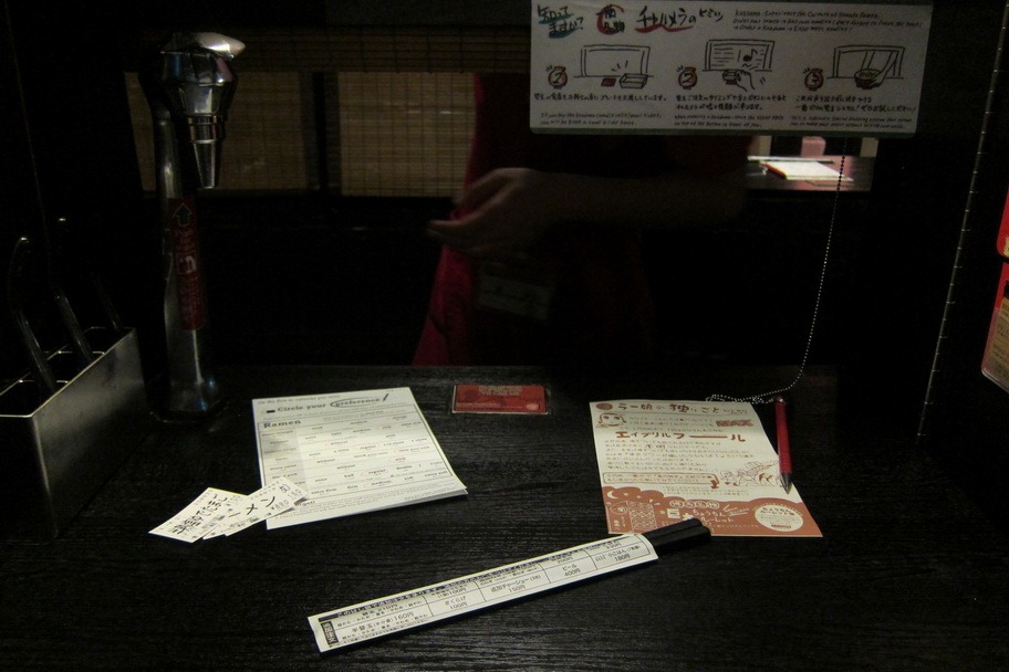 Second, you find a seat at a booth by checking the electronic seating chart to see if any seats are available. If none are available, you have to wait. Third, once you have a booth, you fill out a form to indicate your personal preferences for your ramen, such as flavor, richness, garlic, green onions, noodle firmness, etc. Fourth, you give the form and your vending machine tickets to someone through the window in the booth. You cannot see the person’s face, and there is no communication.