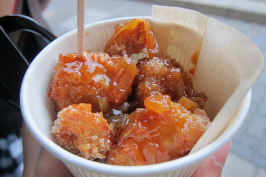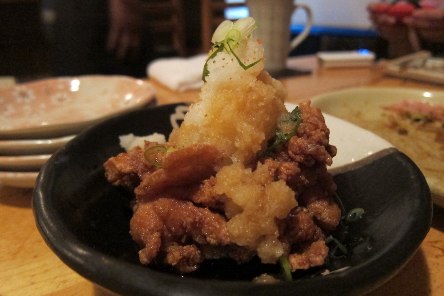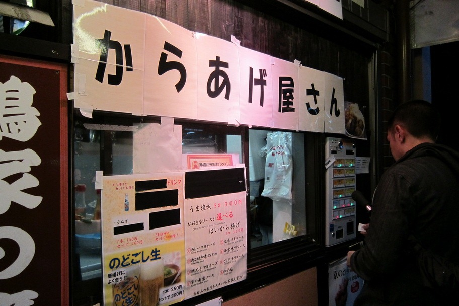 Finally, another noteworthy karaage place is right across the street from the Yasaka Shrine in Gion. It is just a little stand with a vending machine out front from which you order the karaage. We tried it on its own as well as with hot chili sauce and green onion sauce. The green onion sauce proved to be the winner.