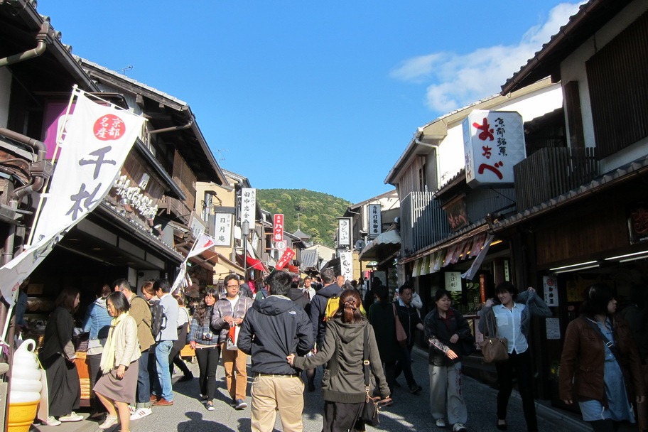 The density of shops culminates in a narrow street full of street vendors and souvenir shops, dropping you at the entrance to the World Heritage Kiyomizu Temple (The “Pure Water” Temple). Entrance costs 300 yen.
