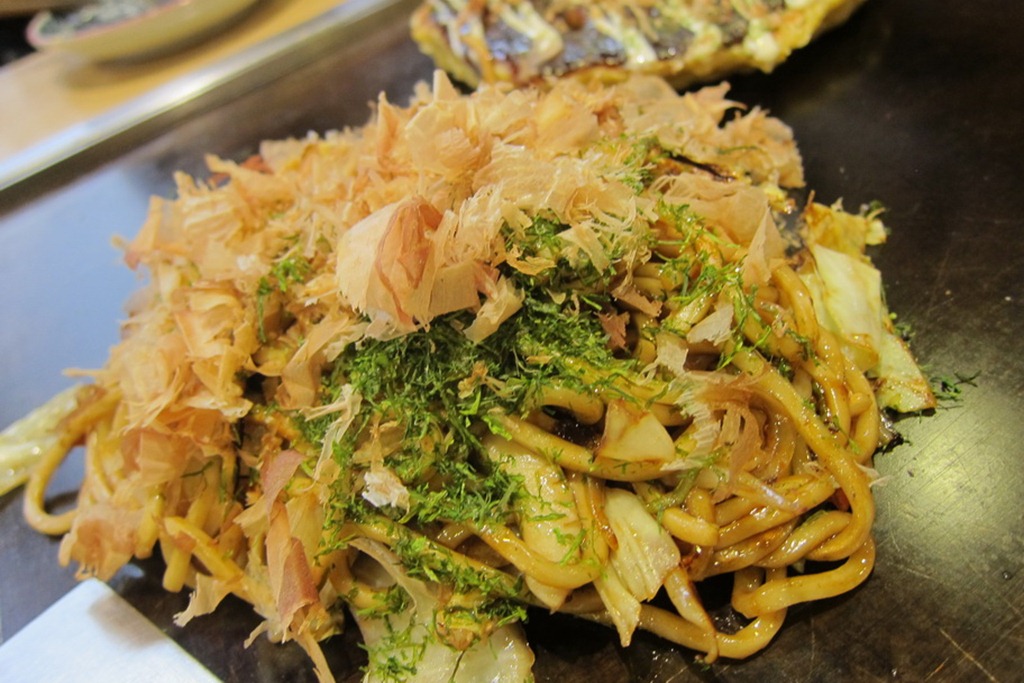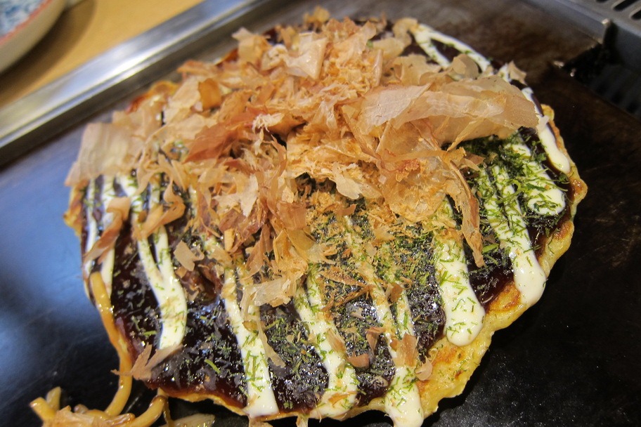 Okonomi-Yaki is a kind of pancake stuffed with cabbage, meat, shrimp, eggs, and any number of ingredients. It’s topped with a “special sauce,” mayo, bonita flakes (dried fish shavings), and aonomi (finely grated seaweed) . The batter is prepared ahead of time and partially cooked, then delivered to your table where you finish the job on your own grill.