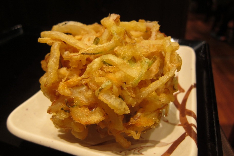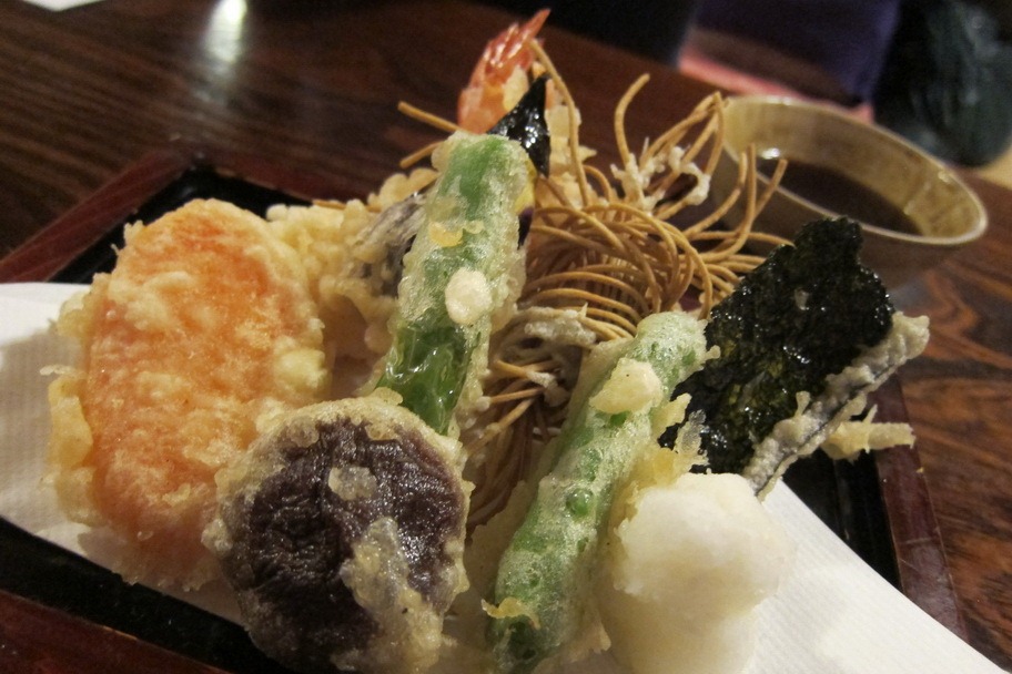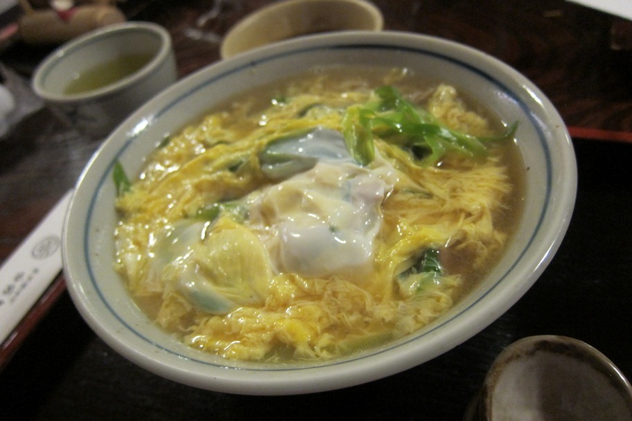 KyotoSakyo Ward) for its famous soba. As an appetizer, we ordered the tempura veggies and soba. Then, we sampled three different types of kake soba – one with mushroom and yuzu, another with chicken and leeks, and the third with scrambled egg. The soba, which is also made fresh on the premises, was perfect for the rainy weather we were having that day. However, the soba was about 1,000 yen each so it’s a bit more expensive than the udon from Marugame Udon.
