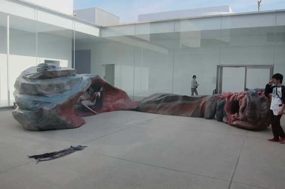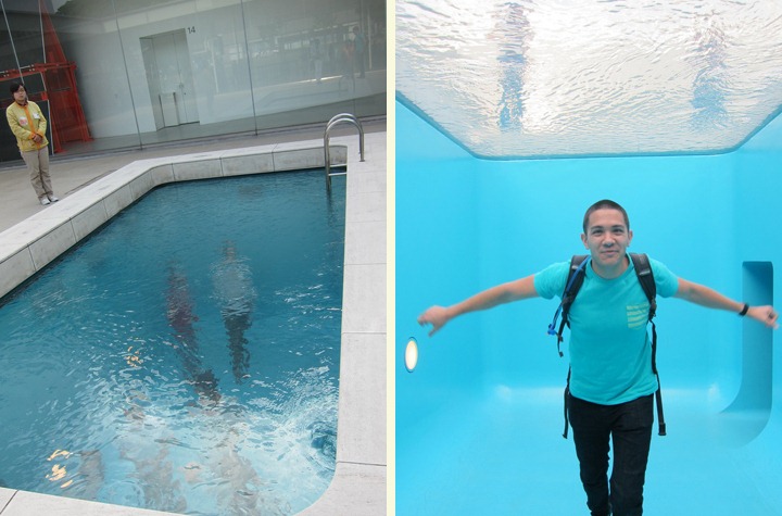 Finally, we visited the 21st Century Museum of Contemporary Art, which is quite modern and in stark contrast to the rest of Kanazawa. The museum focuses on art from 1980 and after. Surprisingly, Mr. Selfish and I enjoyed the museum, but you couldn’t take photos of most of it. We were allowed to take photos of the swimming pool, which has an optical illusion with a pane of glass separating the water from the bottom.