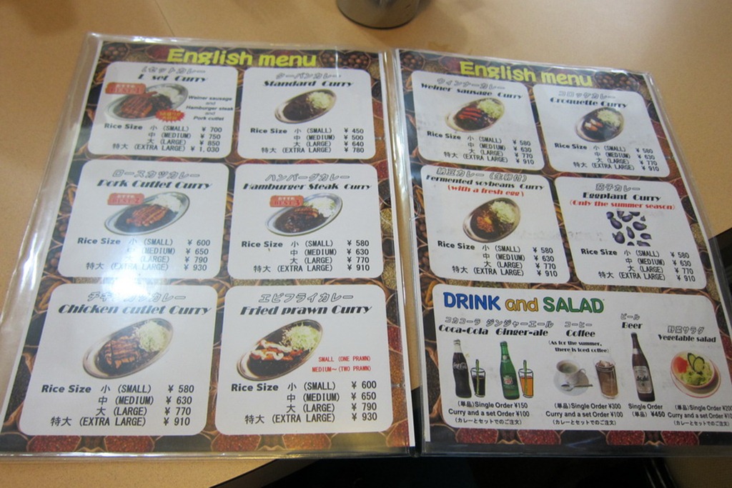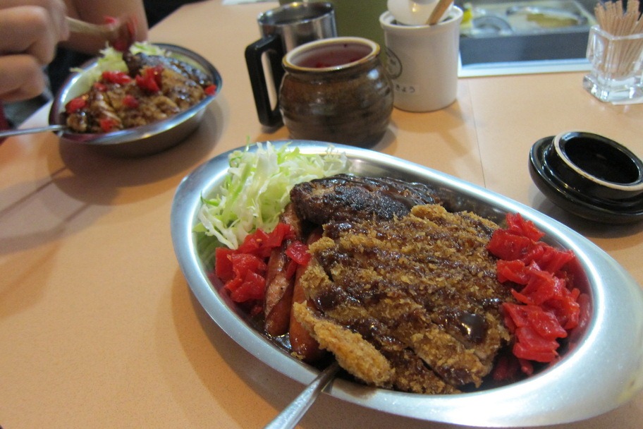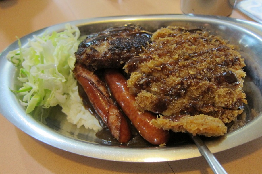 Mrs. Selfish and I both ordered their most popular dish – a portion of curry topped with pork katsu, sausages, and half a hamburger patty. At 700 yen (~$7), you really get value for money – though you may feel slightly greasy afterward.