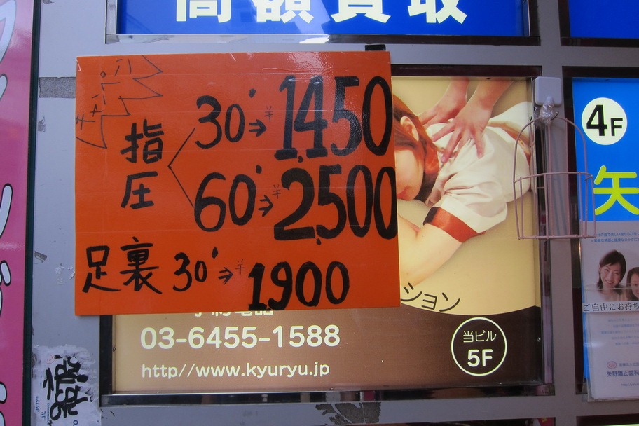 Fortunately, also sells cheap massages. While strolling by, Mrs. Selfish and I noticed a sign for an hour long shiatsu massage for only 2500 yen (~$25), a steal in anyone’s book.