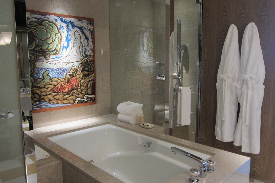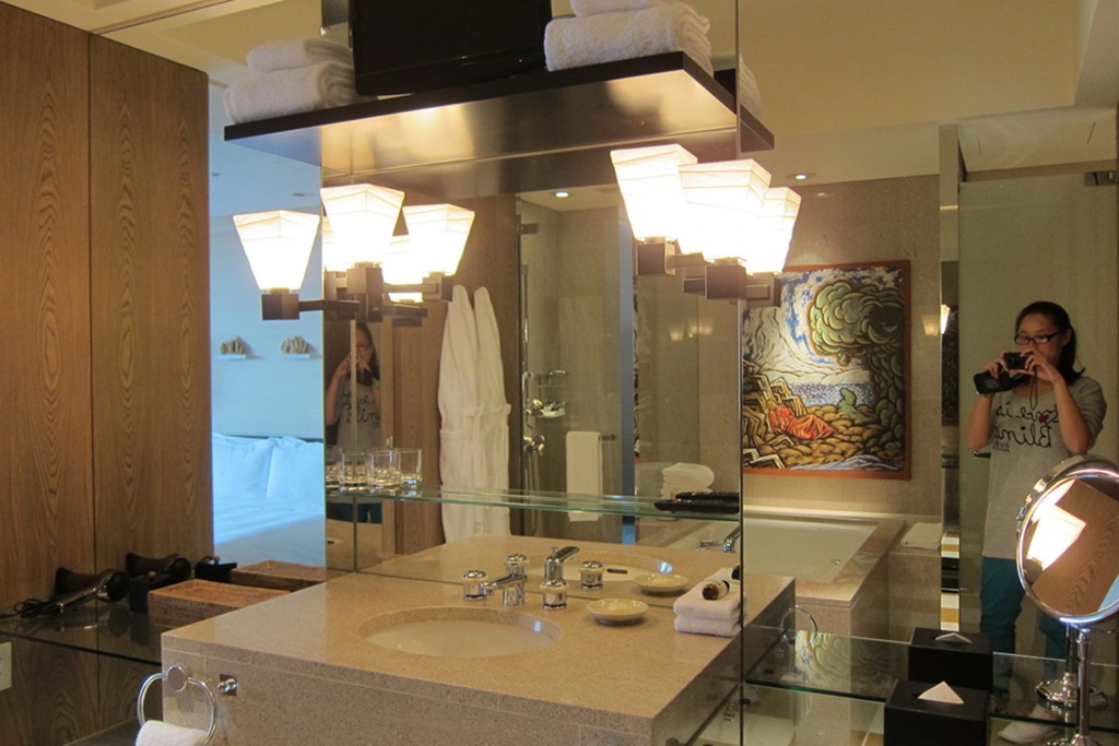 The bathroom was pretty slick, however, with a roomy bathtub, waterfall style shower, Toto toilet, and a separate areas for Mrs. Selfish to do her hair and apply makeup. The amenities kit was generous as well, with all of the standard bathroom accoutrements provided by Aesop.