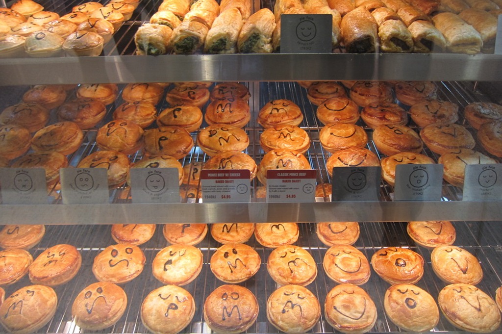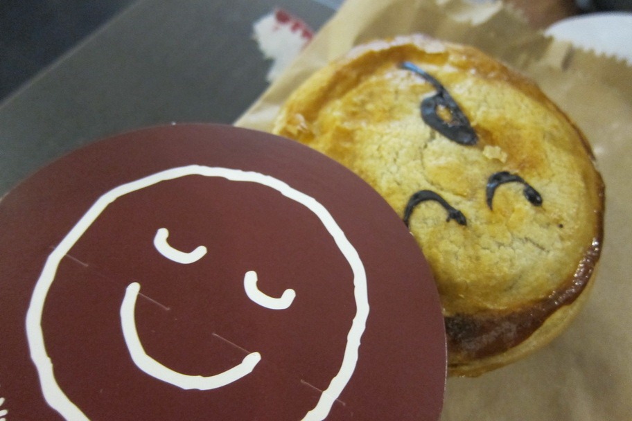 For our last and final pie (at least in Sydney), Mrs. Selfish and I decided to try Pie Face, a major Aussie Pie chain. The pies are cutsie and are actually decorated with little faces, hence the name.