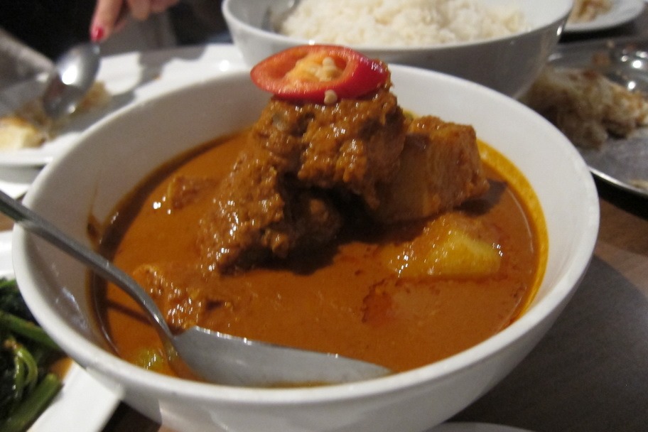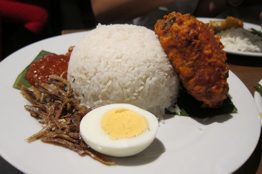 We also ordered the kari cambing, which is spicy lamb curry ($16); the nasi lemak, which is coconut rice with sambal, peanuts, crispy anchovies, cucumber, a hard-boiled egg, and fried chicken ($11.50); and the kangkung belacan, which is stir-fried water spinach with chilies and shrimp paste ($14).