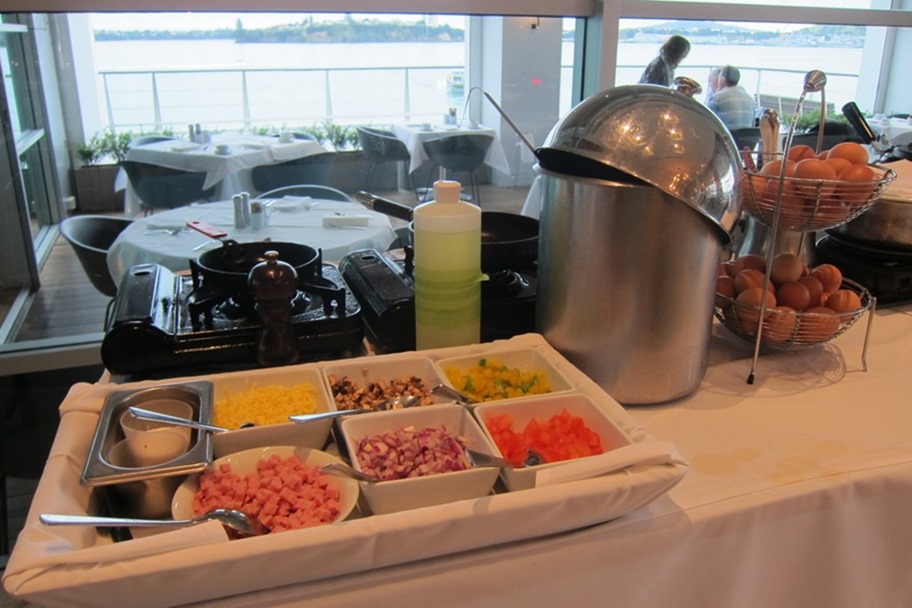 Breakfast at the Hilton Auckland is pretty standard continental fare, plus bacon and an omelet station. There is also a fine selection of fruits, yogurts, and cereals.