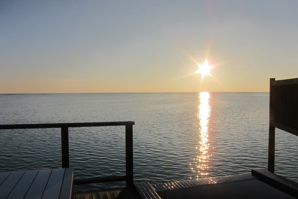 The overwater bungalow has a set of stairs that drop off right into the water. Unfortunately, on the west side the water is rather shallow (or at least it was in November), and was only about 3 feet deep.