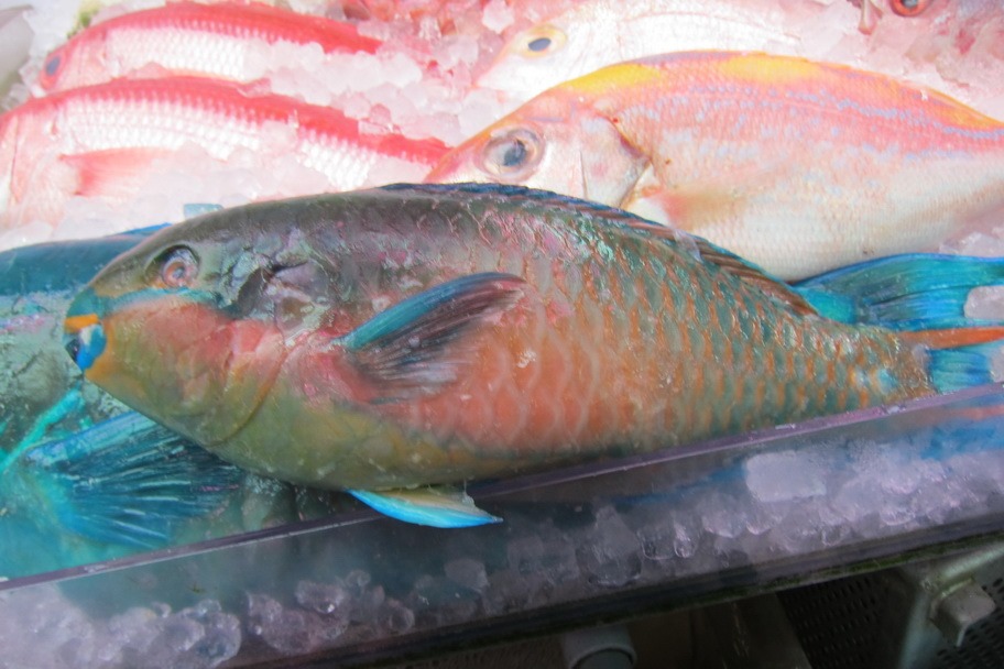 Mr. Selfish and I wandered around browsing the market and then we happened upon some interesting looking fish. We ended up buying the colorful fish below and a sashimi set.