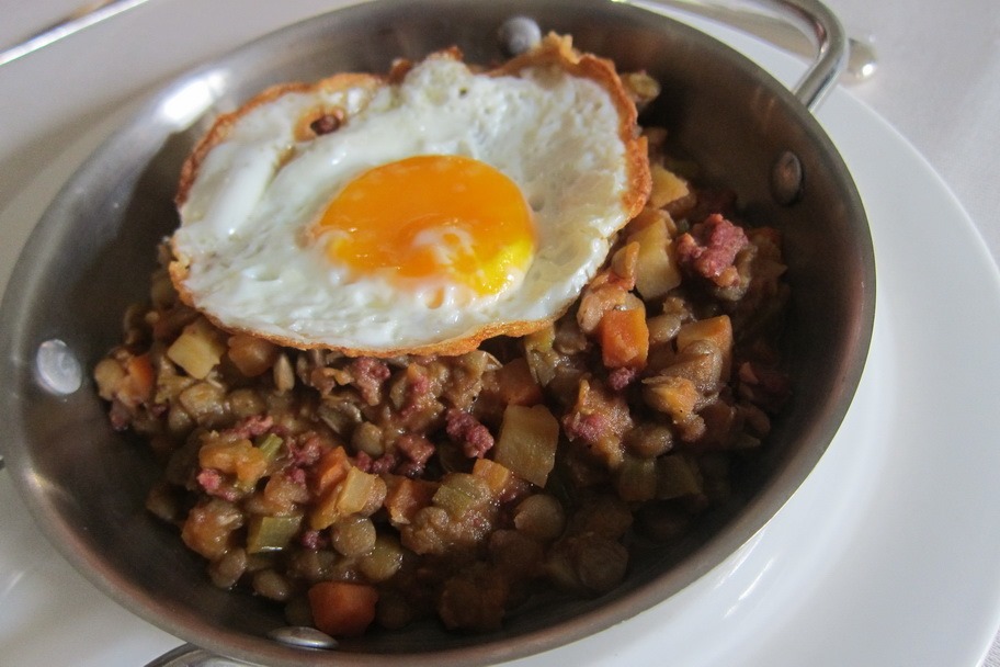 Spiced brown lentils, sucuk, and fried egg. Lentils mixed with a spiced sausage hash, topped with a fried egg. Our favorite dish by far.