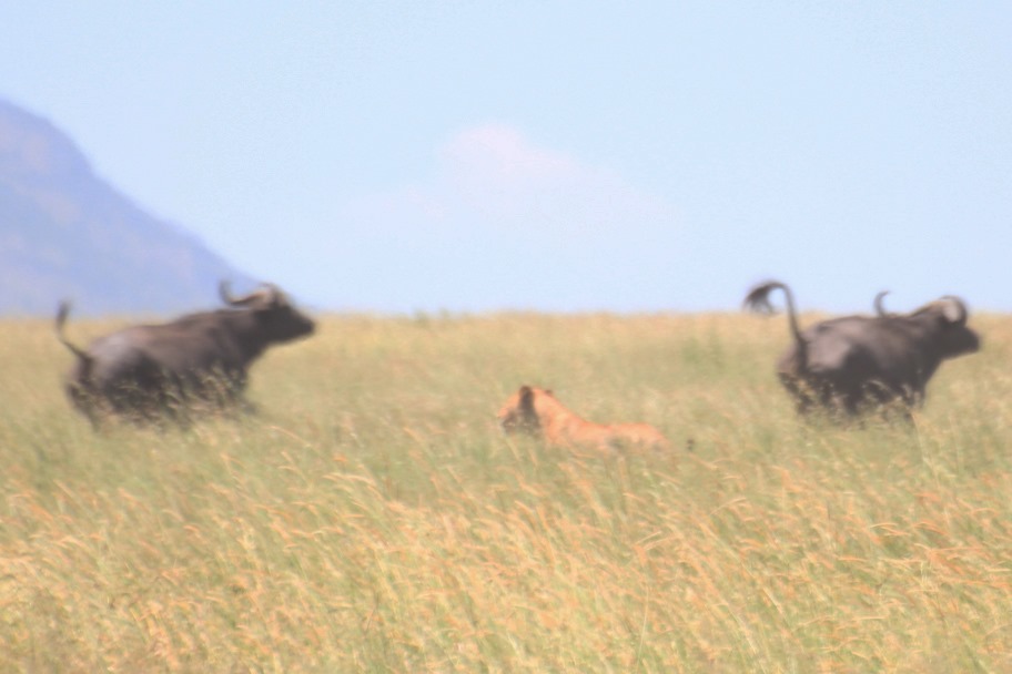 Sorely defeated, the two lionesses rejoined the rest of the pride. To be honest, it seemed improbable that the pride could have out muscled the herd since the herd was 100+ buffalo strong. According to our guide, however, the lionesses typically work together.