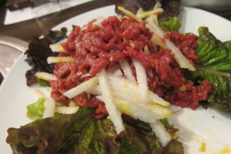 While I have no problems with the ribs (they were quite tasty, and the dipping sauce was excellent), the “raw slices of marinated beef” felt like nothing more than glorified hamburger meat. Very little depth of flavor and almost no marinade flavor to speak of.