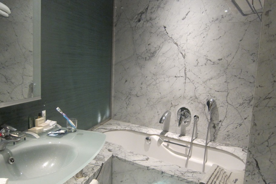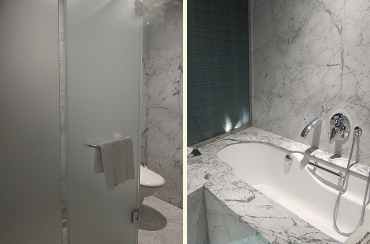 One odd feature of the room was the bathroom, which didn’t have a real wall, but instead had a glass wall separating it from the bedroom. Presumably this was so you could have a view of the Acropolis while taking a bath, but who knows what the architect was thinking?