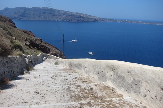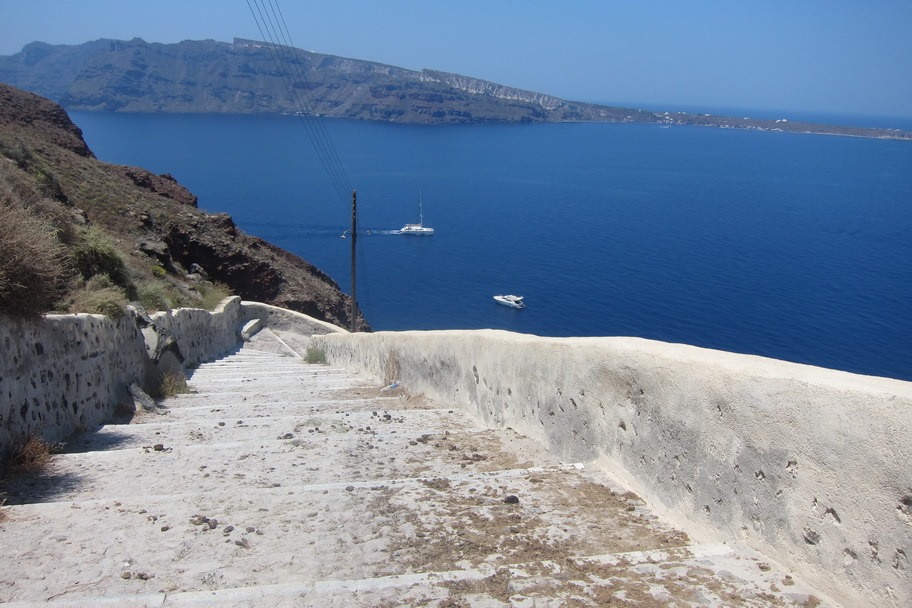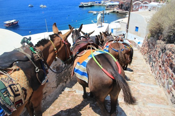 To get to Amoudi Bay, you take the 260 steps from the area where you take photos of the sunset all the way down. If you don’t feel like walking, you can always hire a donkey, but typically, people hire a donkey for the way up. The steps are uneven and a little steep but afford great views along the way.