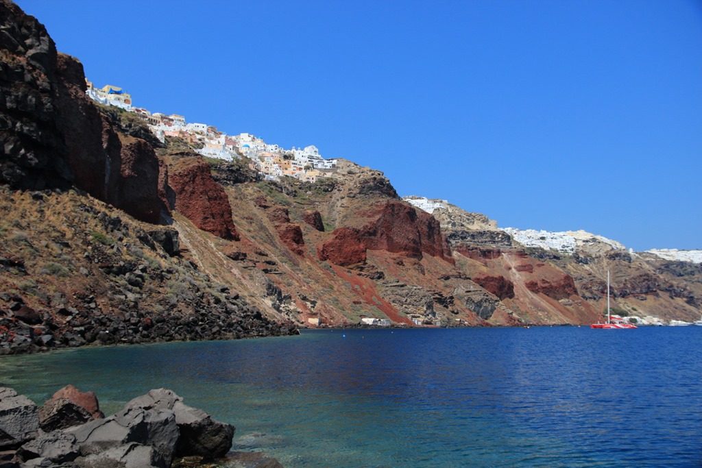 Amoudi Bay itself is goregous. If you head right at the bottom of the steps, you’ll come upon a few seafood restaurants. If you head left, you’ll go toward the cliffs where you can swim.