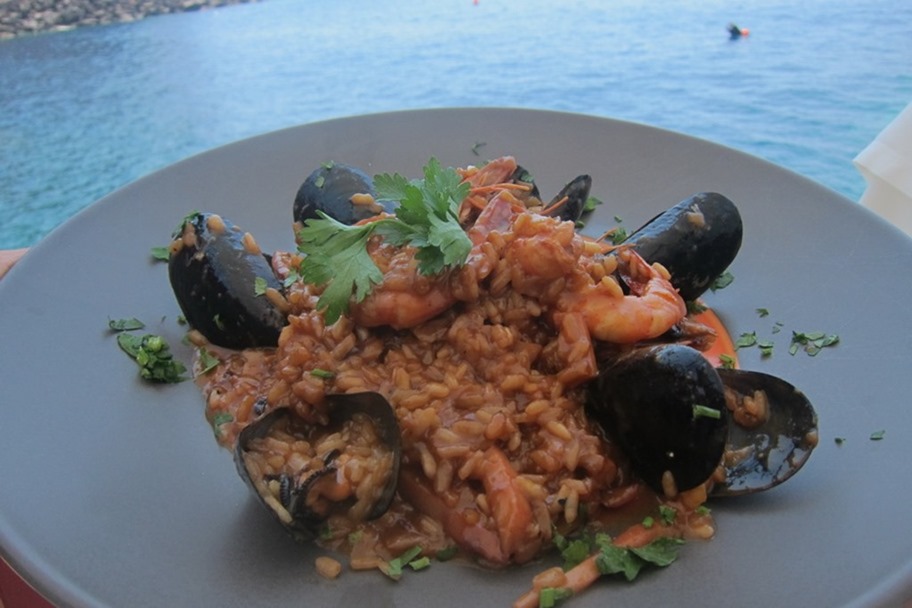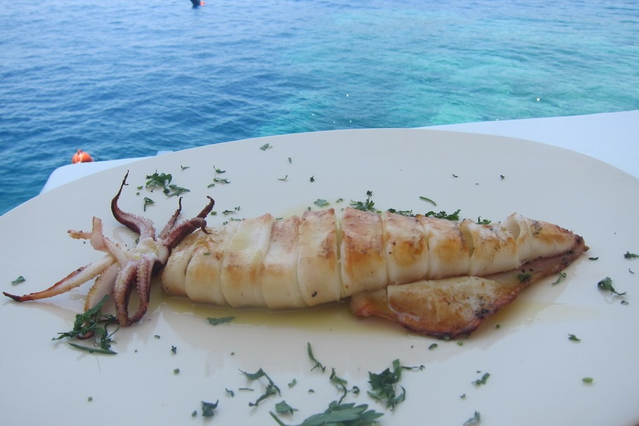 We had heard the meal was a little pricey, so decided to go for lunch. Good thing, too, since it turns out they charge 25 euros per kilo of squid! More than a little famished, Mrs. Selfish and I ordered a half kilo of squid, seafood risotto, and some bread for starters.