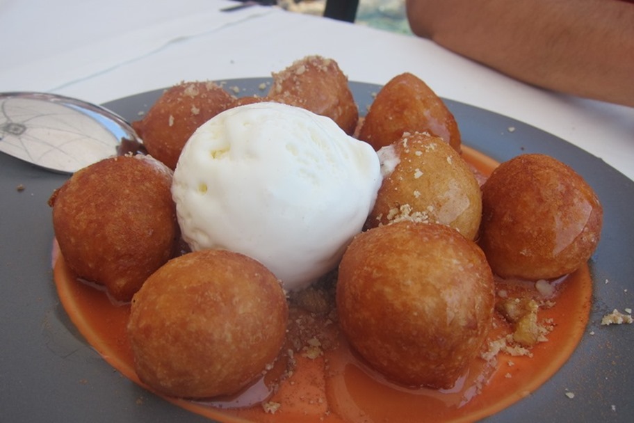 After finishing the risotto, Mrs. Selfish and I were pretty stuffed. It was at this point our waiter surprised us with complimentary dessert – some sort of Greek donuts in honey with vanilla ice cream.