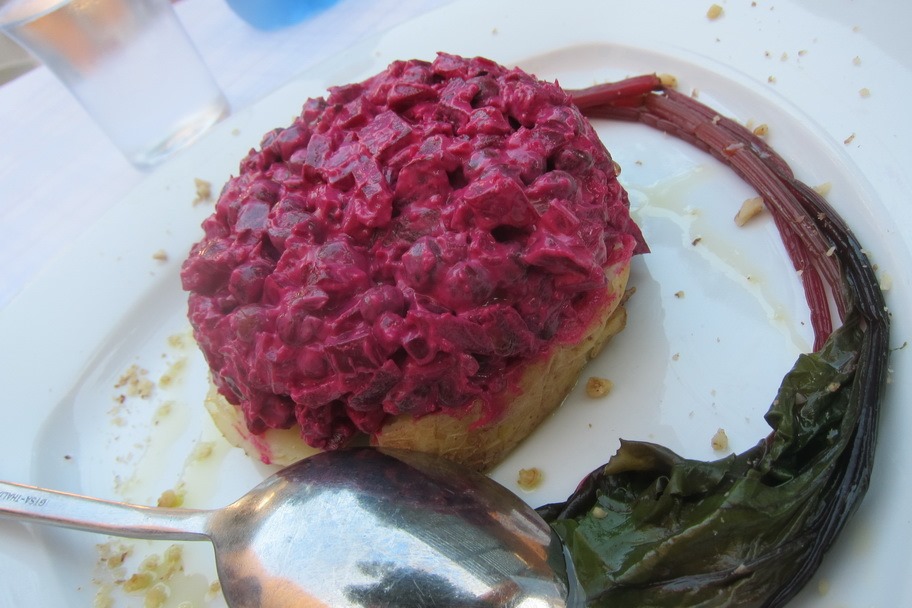 Finely sliced beetroots are marinated in a vinegar and garlic yogurt sauce and served on top of potato slices. Light, while still creamy, this was a delicious way to kick off the meal.