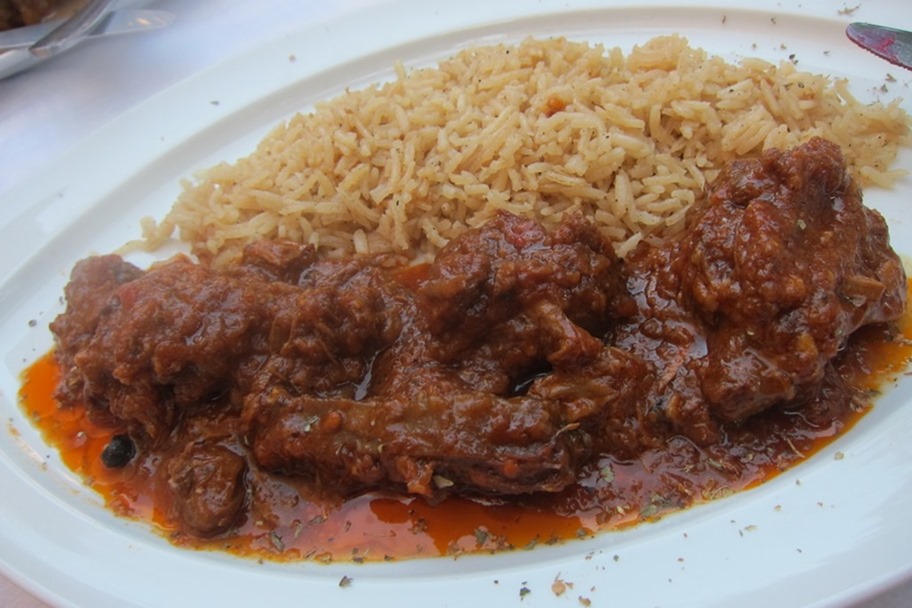 Slices of pork sautéed in a mushroom sauce with green, white, and pink peppercorns and served with a side of rice. Very, very savory with just a little kick. So good.