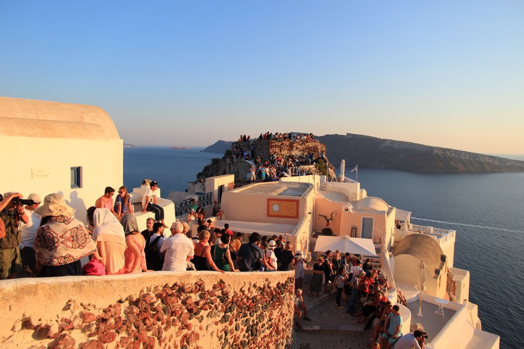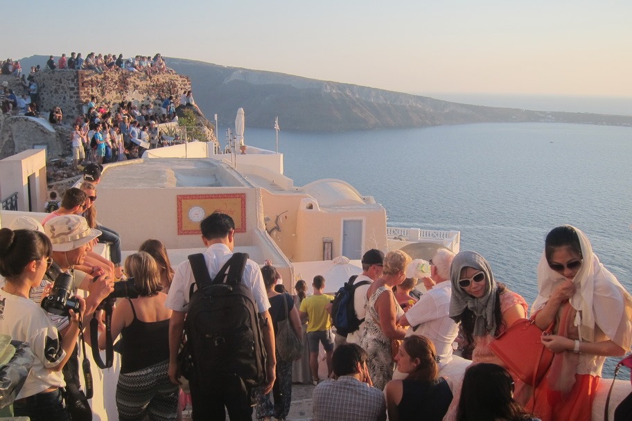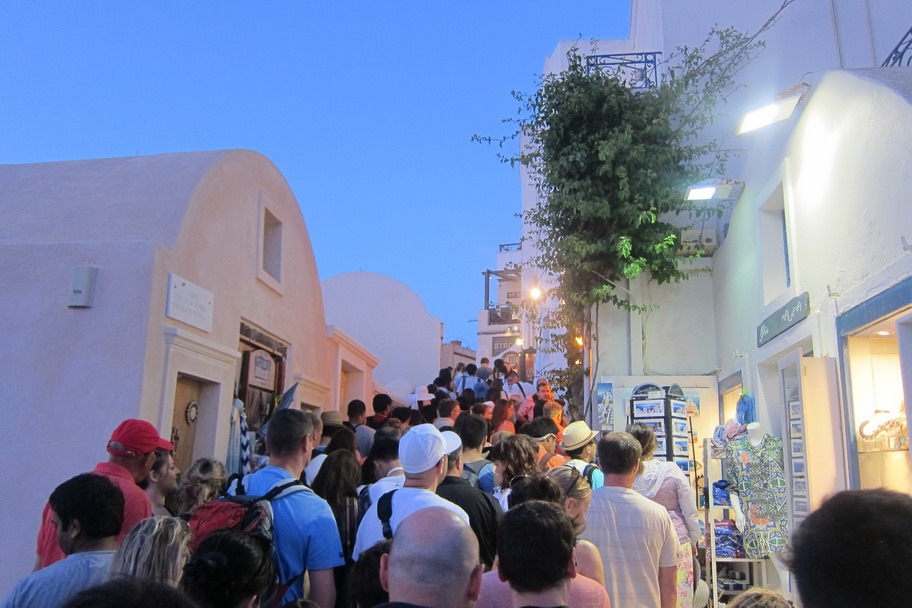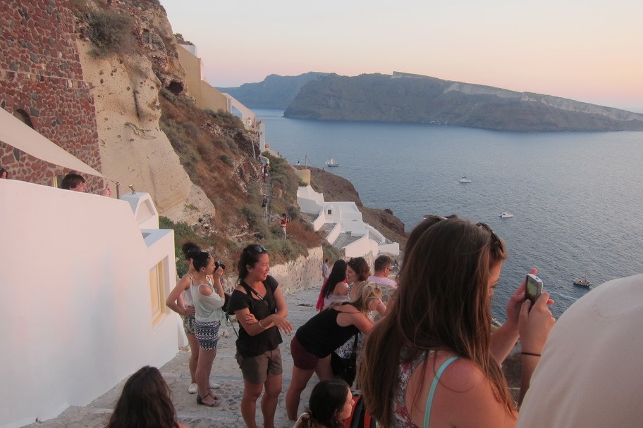 This shot was awesome – look at that sunset. Not a person in sight right? I mean, I can totally picture myself sipping a glass of Greek wine and watching it sink from the comfort of my balcony. Well… maybe… if you’re really rich, but for the rest of us the reality involves something a little more like this.
