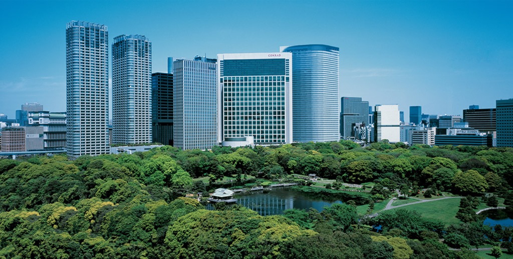 The Conrad Tokyo is located in the Minato neighborhood of Tokyo, just a short walk away from the Tsukiji fish market.