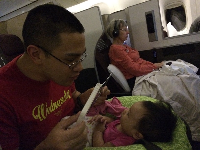 We brought Baby Selfish’s favorite toys, gadgets, and sleeping aides on the flight. Having her “travel boppy” along gave us a comfortable place to put her during our domestic segment, while putting her in her sleep sack subtly cued her that it was time to sleep.