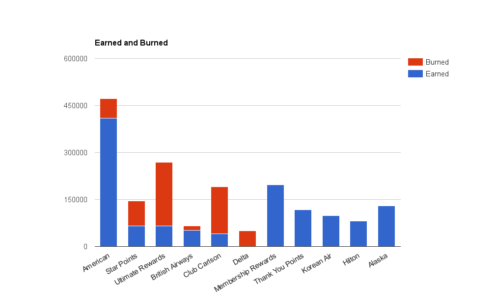 As you can see, the majority of points earned were in American Airlines, with a little over 400,000 miles earned. Next highest were Membership Rewards at close to 200,000, Alaska Miles at 130,000 and Citi Thank You points at 116,000.