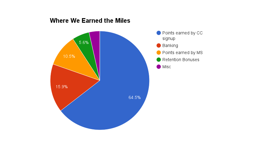 So how did we earn all these points? Mostly through the tried and true method of credit card churning, which accounted for 800K points. Second place goes to the banks which gave us close to 200K points, and third goes to Manufactured Spending, where we earned roughly 130K points. The rest was earned through credit card retention bonuses and normal, every day spend.