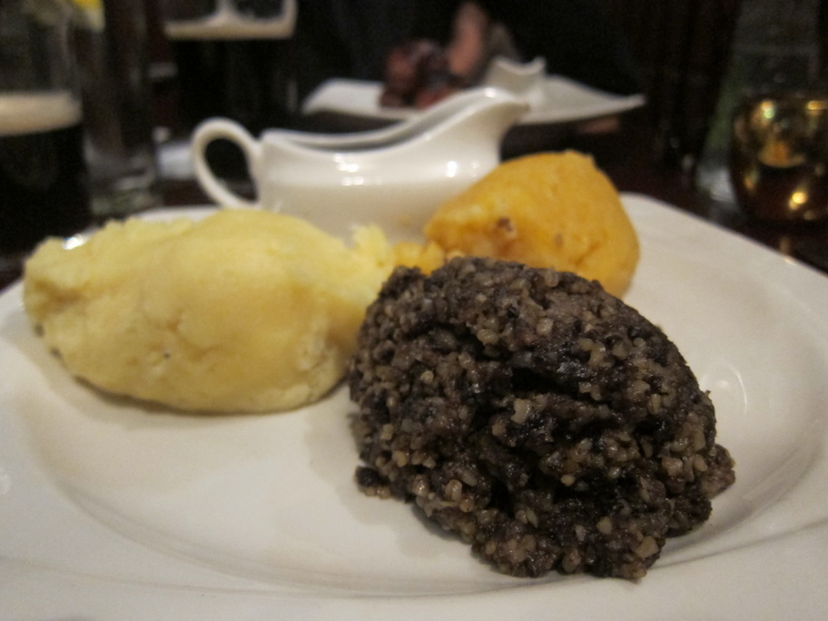 Mr. Selfish and I had heard horror stories about haggis, so we knew that we had to try it. Haggis is the national dish of Scotland. It is prepared from sheep’s parts (heart, liver and lungs) and minced with onion, oatmeal, suet, spices, and salt. Although traditionally it is encased in the animal’s stomach, it is now typically encased in sausage casing.